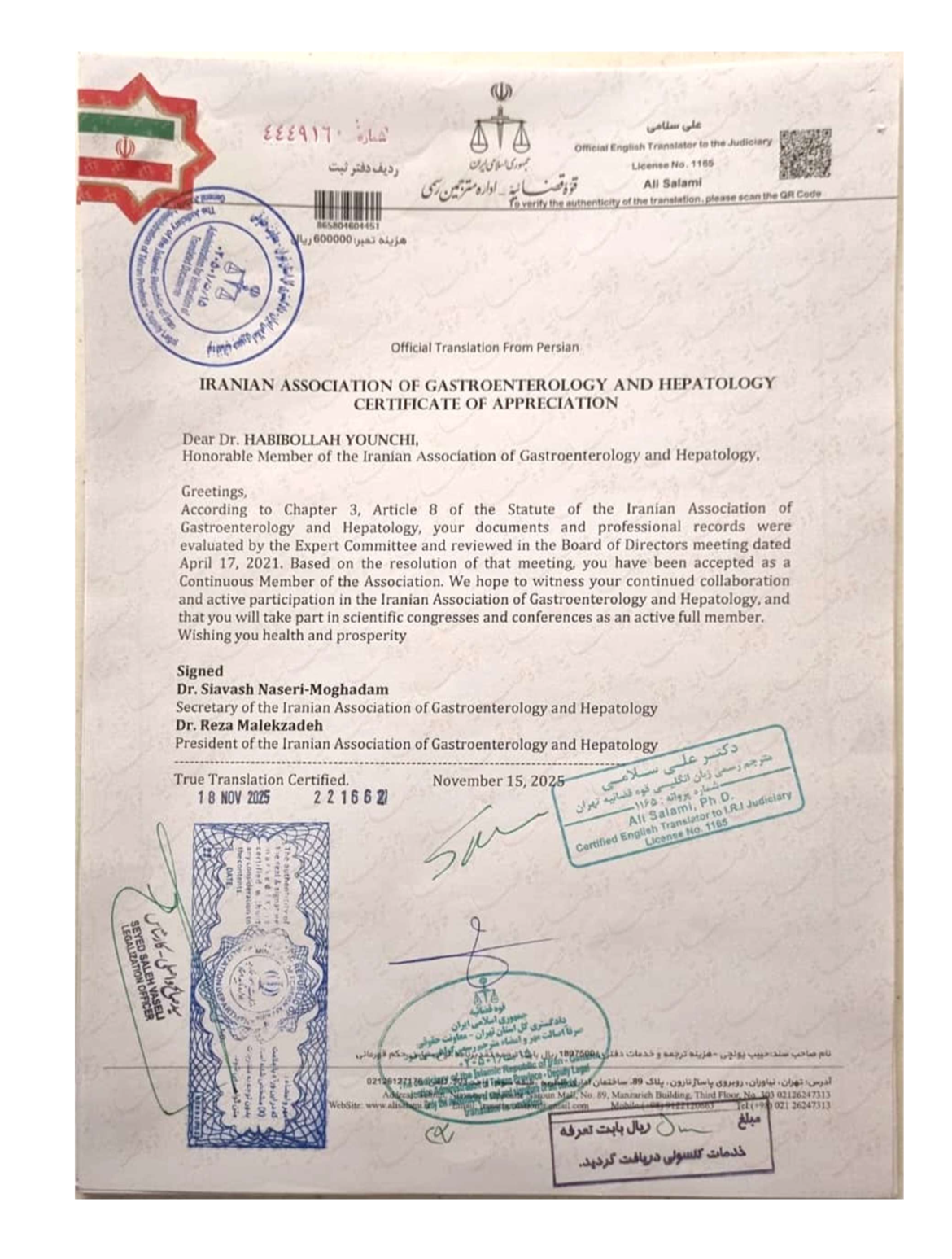 Over nearly three decades of medical practice, Dr. Habibollah Younchi has developed extensive experience in internal medicine and advanced interventional endoscopy. His career trajectory demonstrates continuous innovation in diagnostic techniques, early cancer detection, and minimally invasive therapeutic procedures across leading hospitals in Iran.